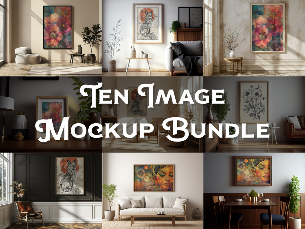 This 10 image frame mockup bundle is perfect for poster shops or digital art. With this mockup collection you will have a large selection of images to display your digital art.